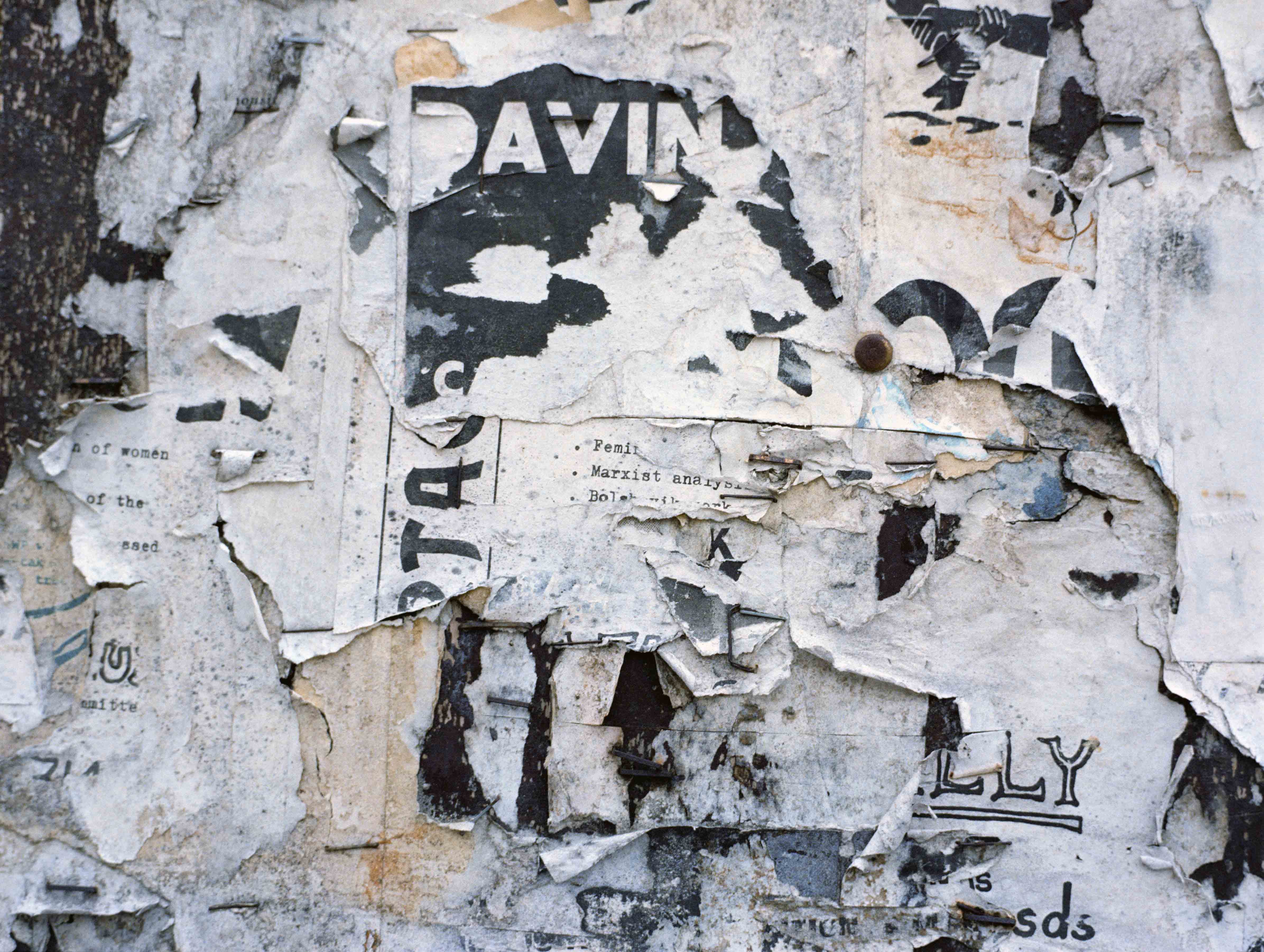 Political posters also played a role, particularly in my décollageseries (created by the tearing away of original images) taken on medium-format film for texture and detail. The posters reflect political agitation of radical factions, marginal Marxist groups, in other words the ferment of the post-Vietnam period. For the most part they were stapled to the rusty iron fire doors of the venerable Harvard Square Theater, which, I recently learned, has been empty for many years. In the harsh New England climate, these posters would weather and peal—or be torn—thus creating an urban palimpsest.