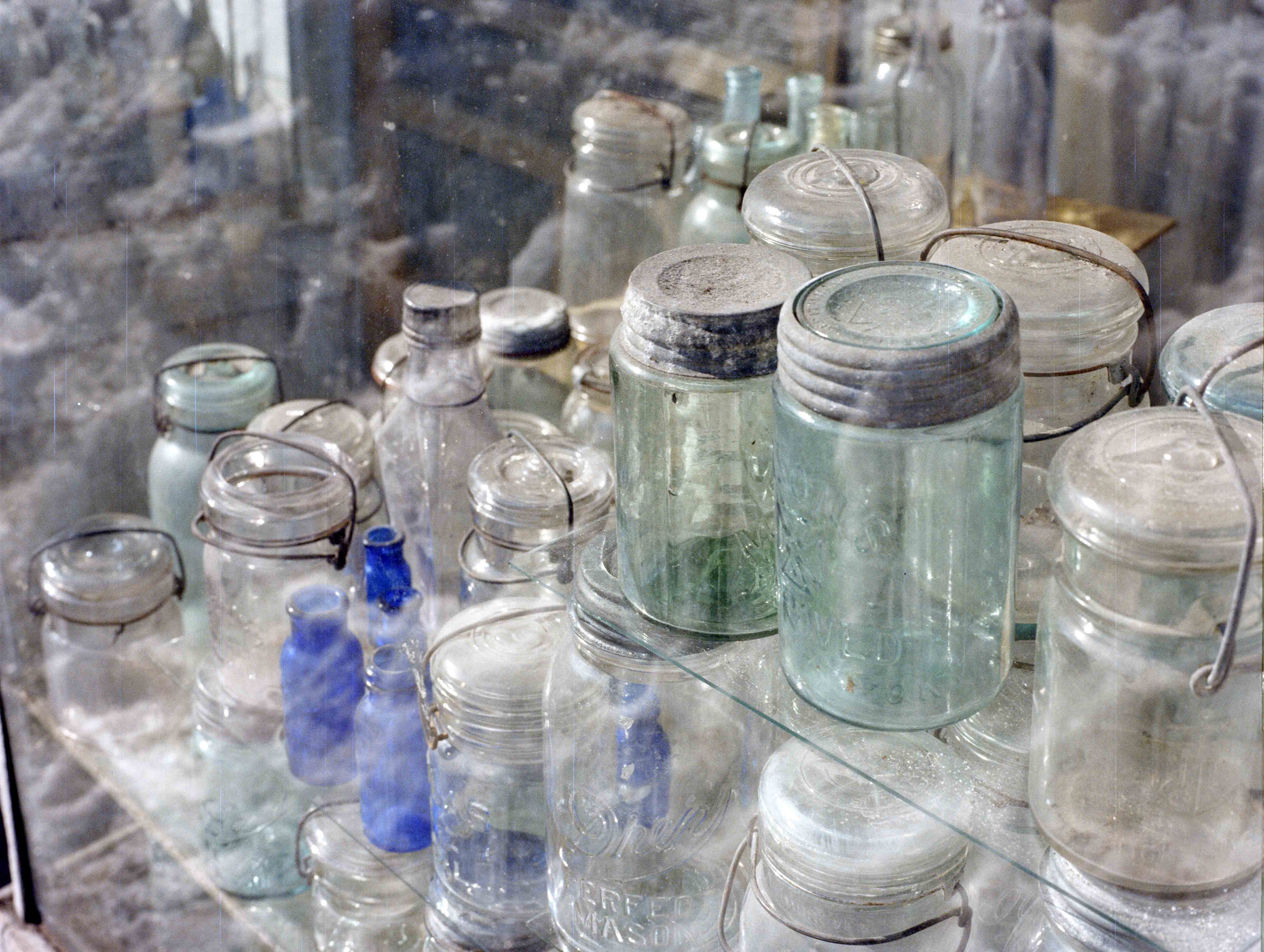(glass jars in former store window near Central Square) March 1978