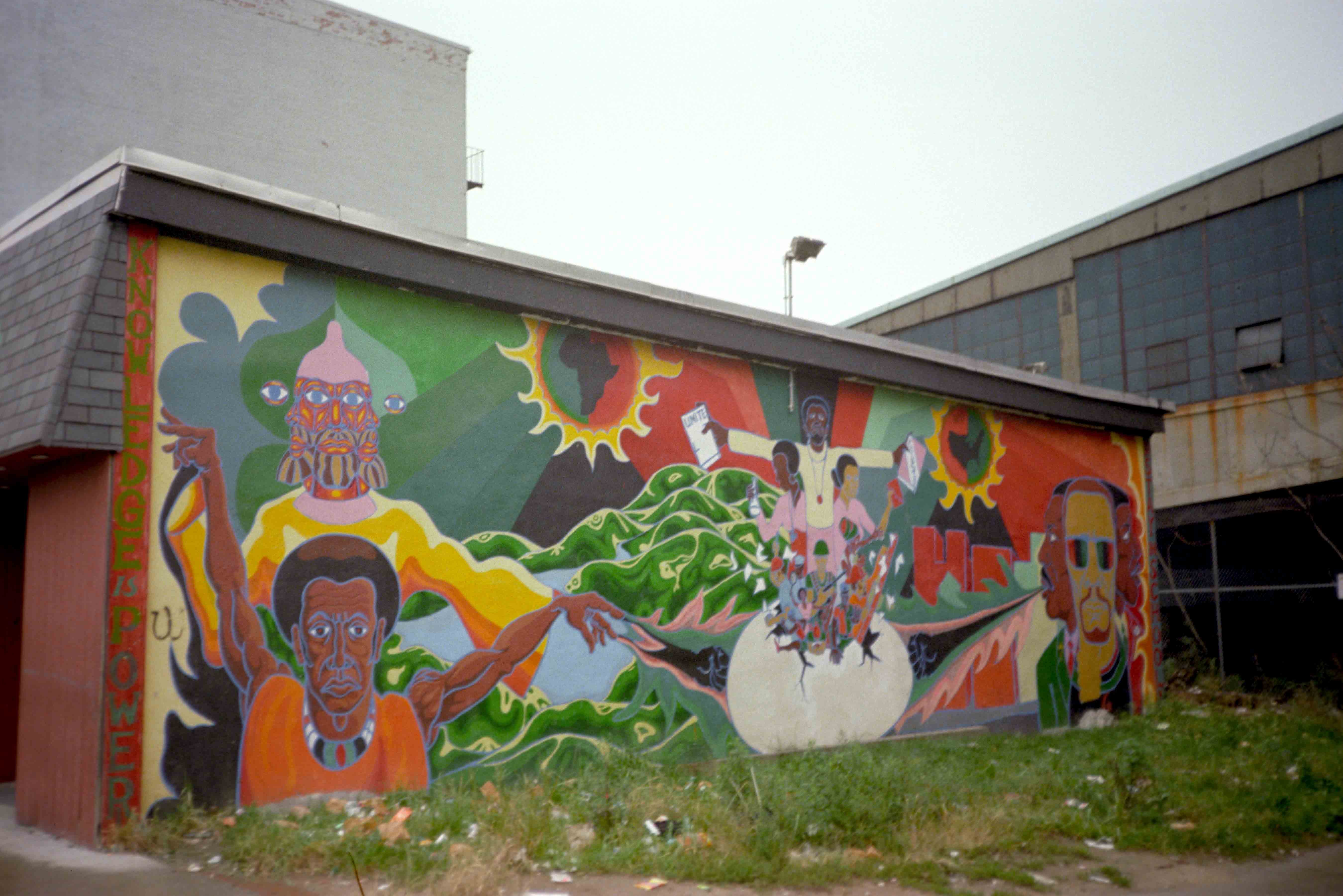 (mural by Dana Chandler on store side, Washington Street near Dudley Square, Roxbury) October 1977