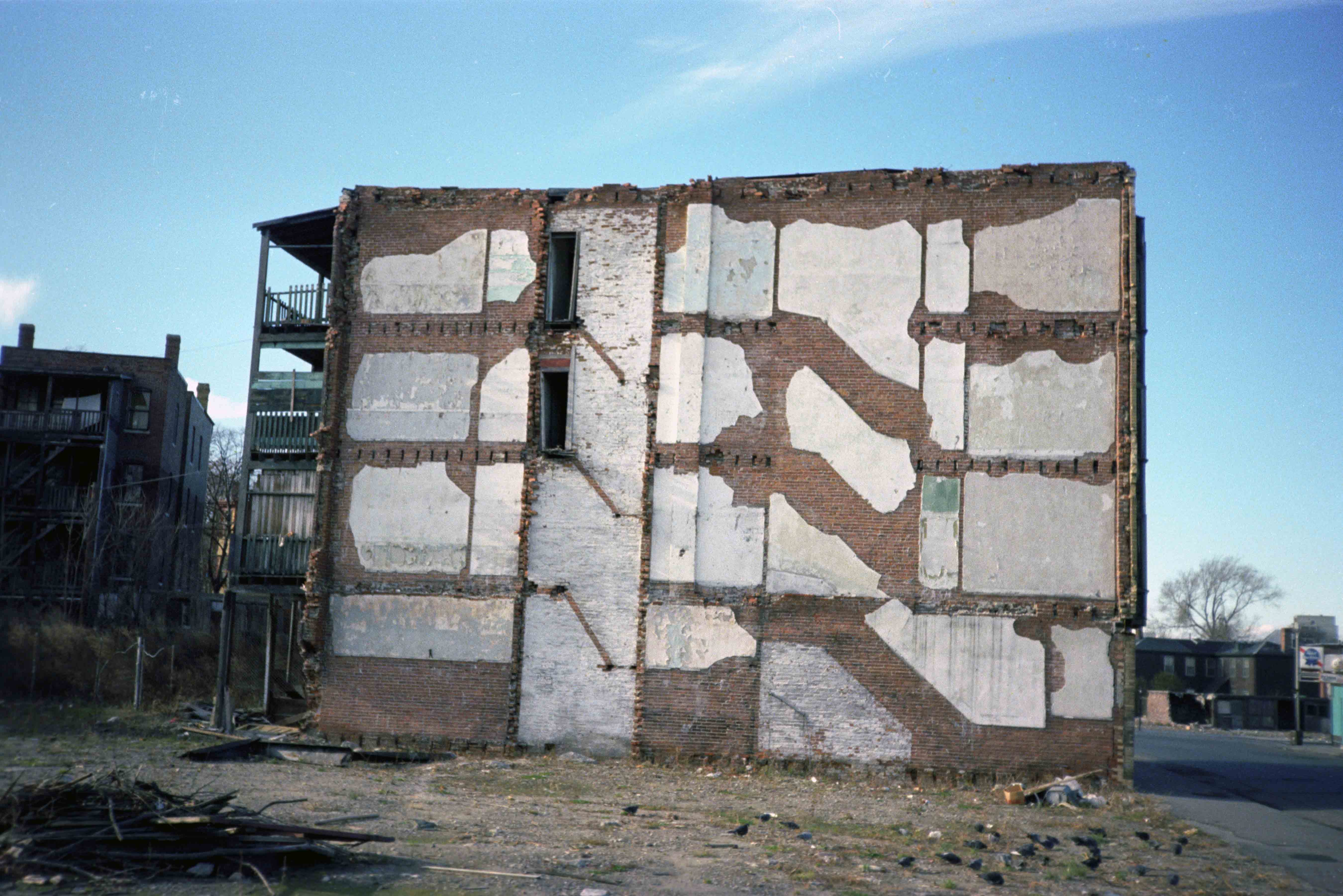 (traces of demolished building on wall of tenement house, Roxbury) December 1977